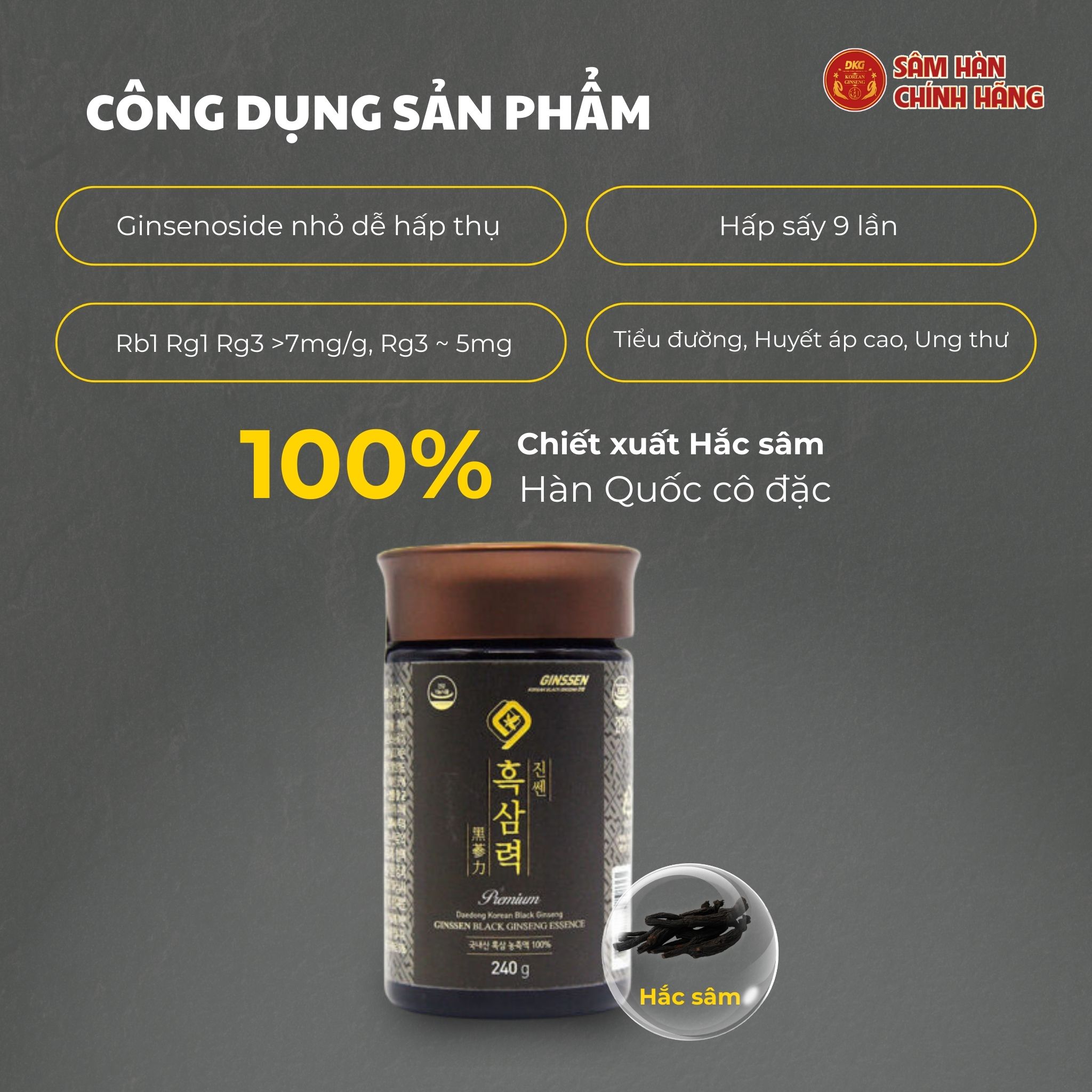 2. Thành phần: Cao hắc sâm cô đặc (Ginsenside Rg1, Rb1 và Rg3 7mg/g) chiếm 100%. Tỷ lệ pha trộn: Rễ chính: 70%, Rễ phụ: 30%.