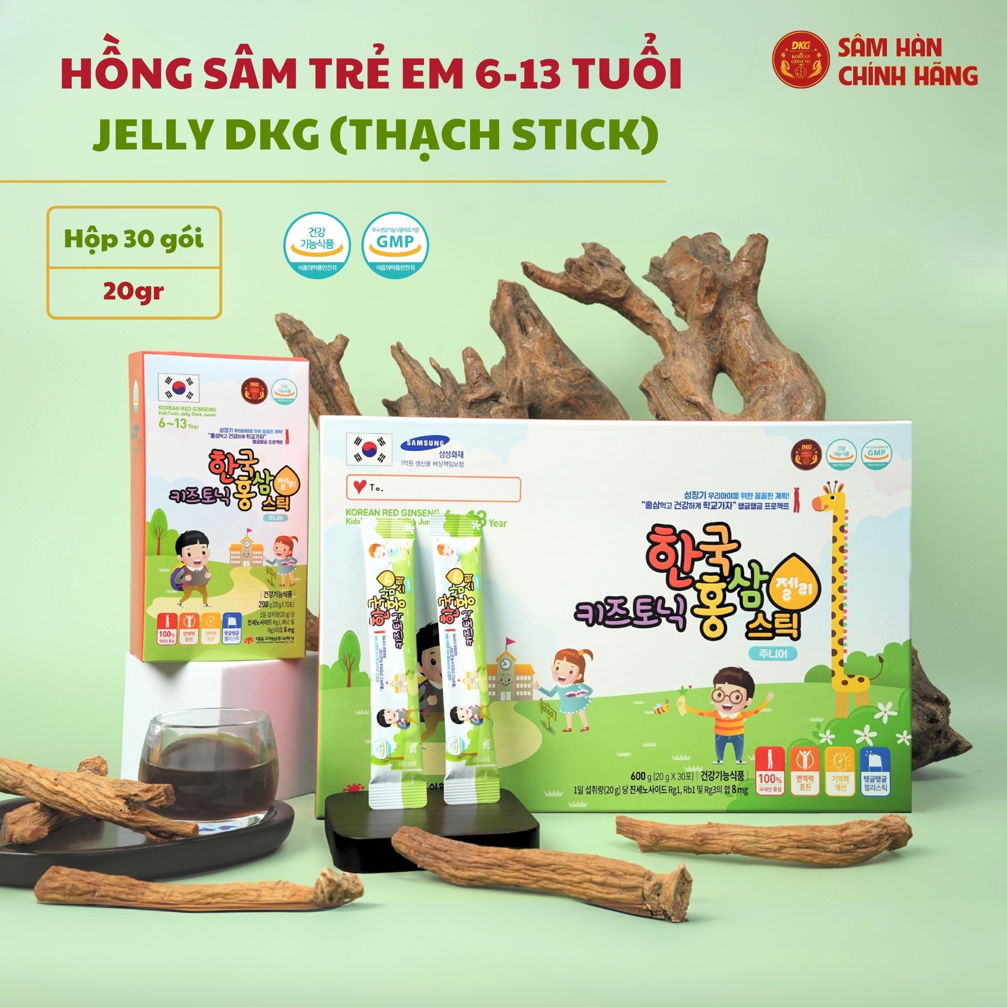 Nguồn thực tế sản phẩm: Sản phẩm Hồng sâm baby DKG Jelly (6–13 tuổi) chứa chiết xuất hồng sâm 6 năm tuổi, DHA, canxi và các vi chất tăng trưởng.