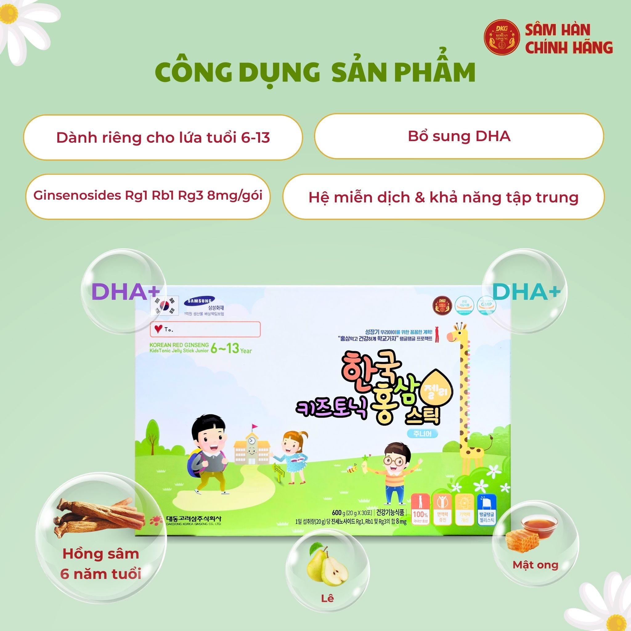 Cải thiện trí nhớ và khả năng tập trung: Trong hồng sâm có các ginsenoside như Rg1 – giúp thúc đẩy quá trình dẫn truyền thần kinh acetylcholine, có liên quan đến trí nhớ và khả năng học tập. Ngoài ra, sản phẩm được bổ sung DHA giúp hỗ trợ phát triển não bộ.
