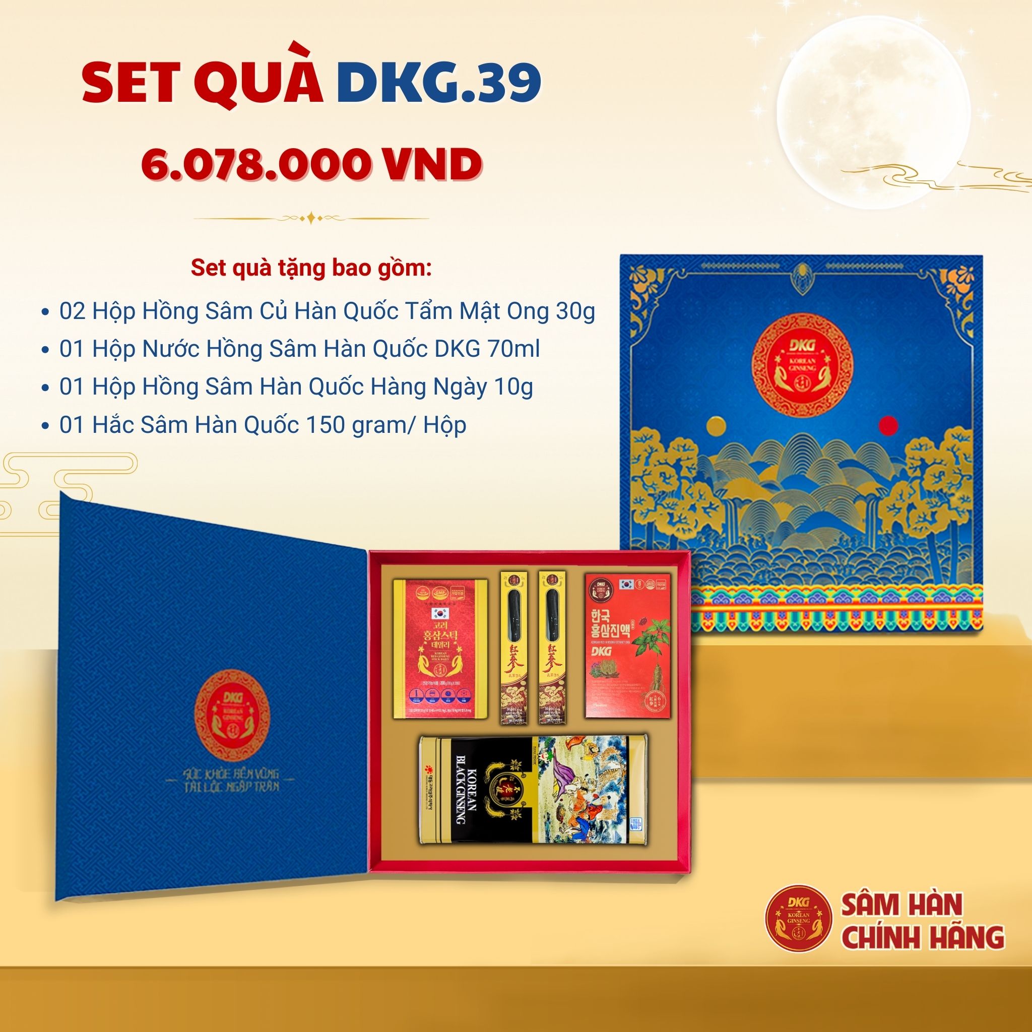 Set quà Tết DKG.39 – đỉnh cao của tinh hoa nhân sâm Hàn Quốc, được thiết kế dành riêng cho những ai muốn gửi tặng sự trân trọng và đẳng cấp. Là set quà cao cấp nhất trong bộ sưu tập Tết 2026, DKG.39 không chỉ mang đến giá trị sức khỏe bền vững từ nhân sâm chính thống Hàn Quốc, mà còn thể hiện sự sang trọng, tinh tế và vị thế của người trao tặng. Với thiết kế hộp quà trang nhã, nội dung sản phẩm chọn lọc từ những tinh hoa thượng hạng, DKG.39 là lựa chọn xứng đáng để gửi gắm lời chúc An khang – Thịnh vượng – Trường tồn đến người thân, đối tác và khách hàng quan trọng.
